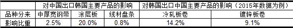 如上表所示,我国对韩出口的主要产品占国内产量比重整体较小,涂层板可能受到的影响较大,主因是国内涂层板产量基数相对较小,对于韩国而言占比均在两个主要对华出口品种占比均相对较大。